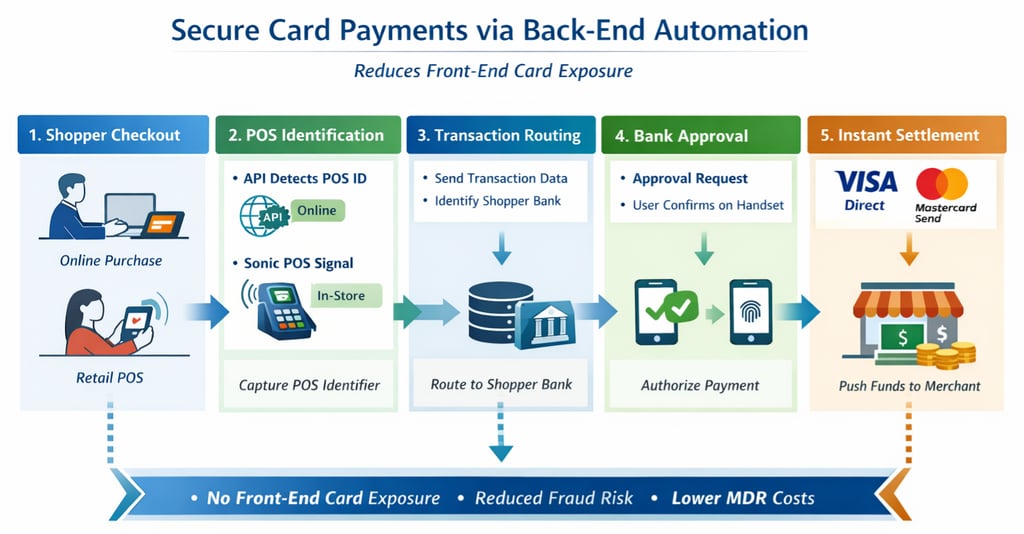 This is done by detecting POS identifiers at checkout - either through API‑based online integrations or through a shopper’s bank or mobile‑wallet app listening for Sonic POS IDs in‑store, and linking each transaction to the correct shopper bank using card on file data. Followed by a bank triggered real‑time approval prompt on the shopper’s handset and, once approved, pushing a card payment to the merchant by Visa Direct or Mastercard Send.